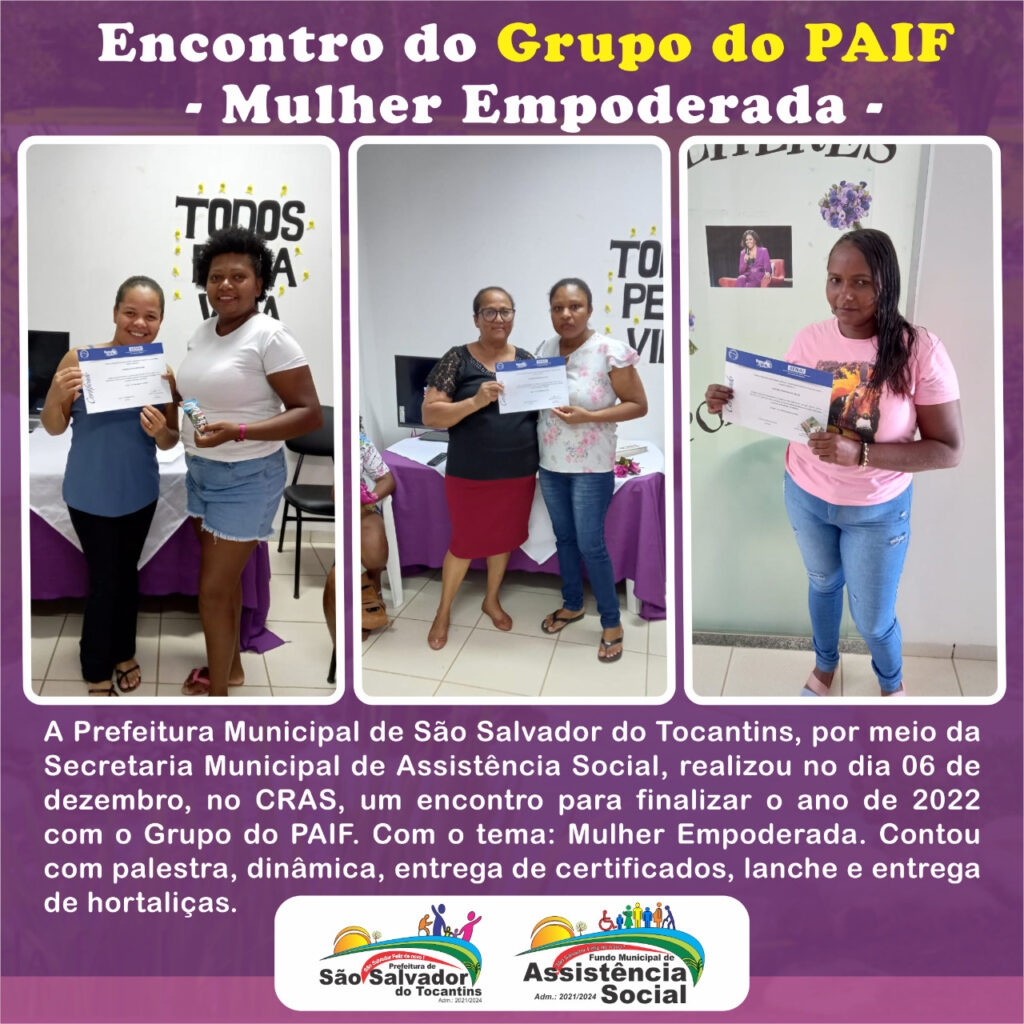 A PREFEITURA MUNICIPAL DE SÃO SALVADOR DO TOCANTINS , POR MEIO DA SECRETARIA MUNICIPAL DE ASSISTENCIA SOCIAL , REALIZOU NO DIA 06 DE DEZEMBRO , NO CRAS UM ENCONTRO PARA FINALIZAR O ANO DE 2022 COM O GRUPO DO PAIF COM O TEMA : MULHER EMPODERADA , CONTOU COM PALESTRA , DINÂMICA ,ENTREGA DE CERTIFICADO, LANCHE E ENTREGA DE HORTALIÇAS